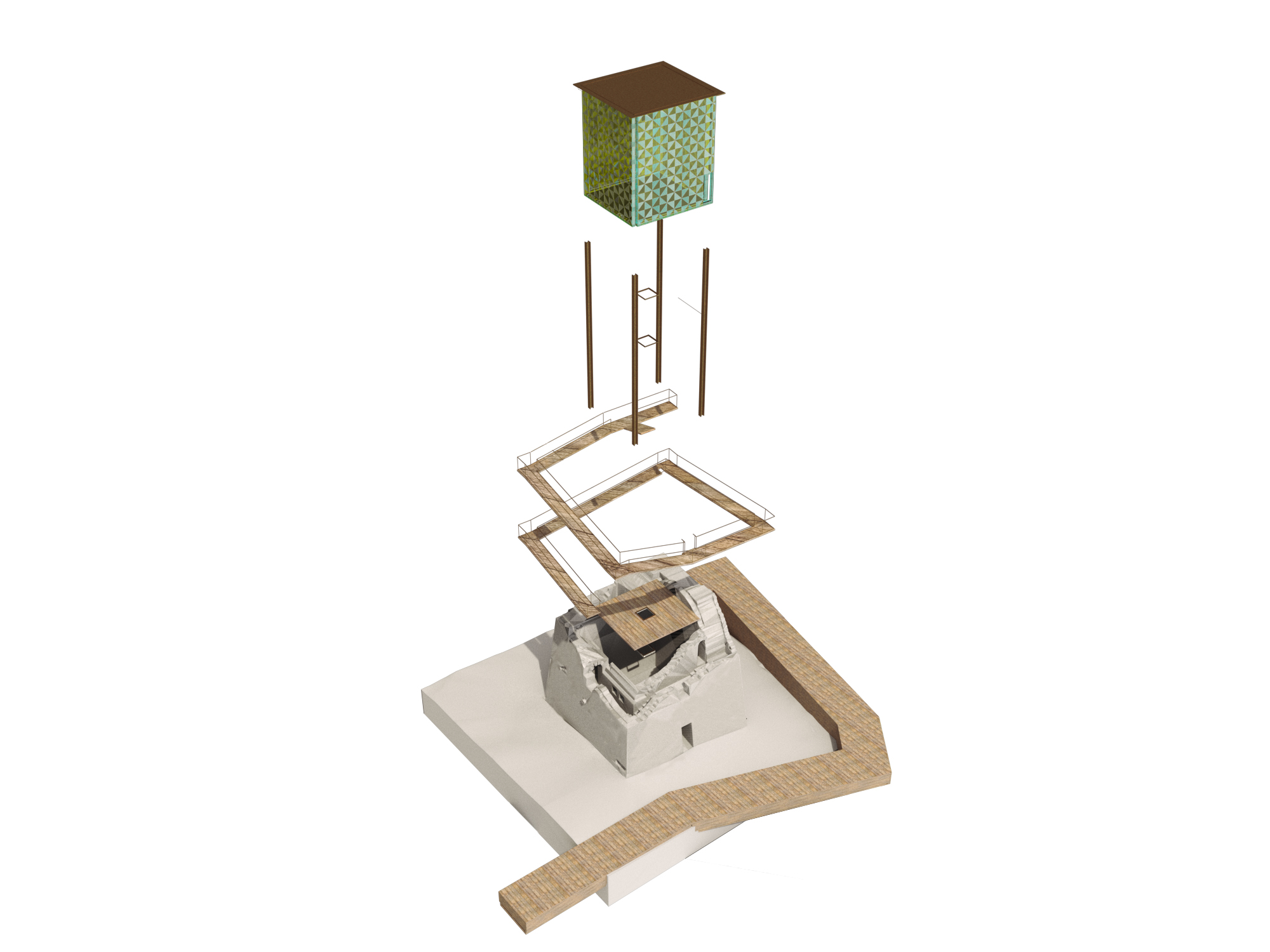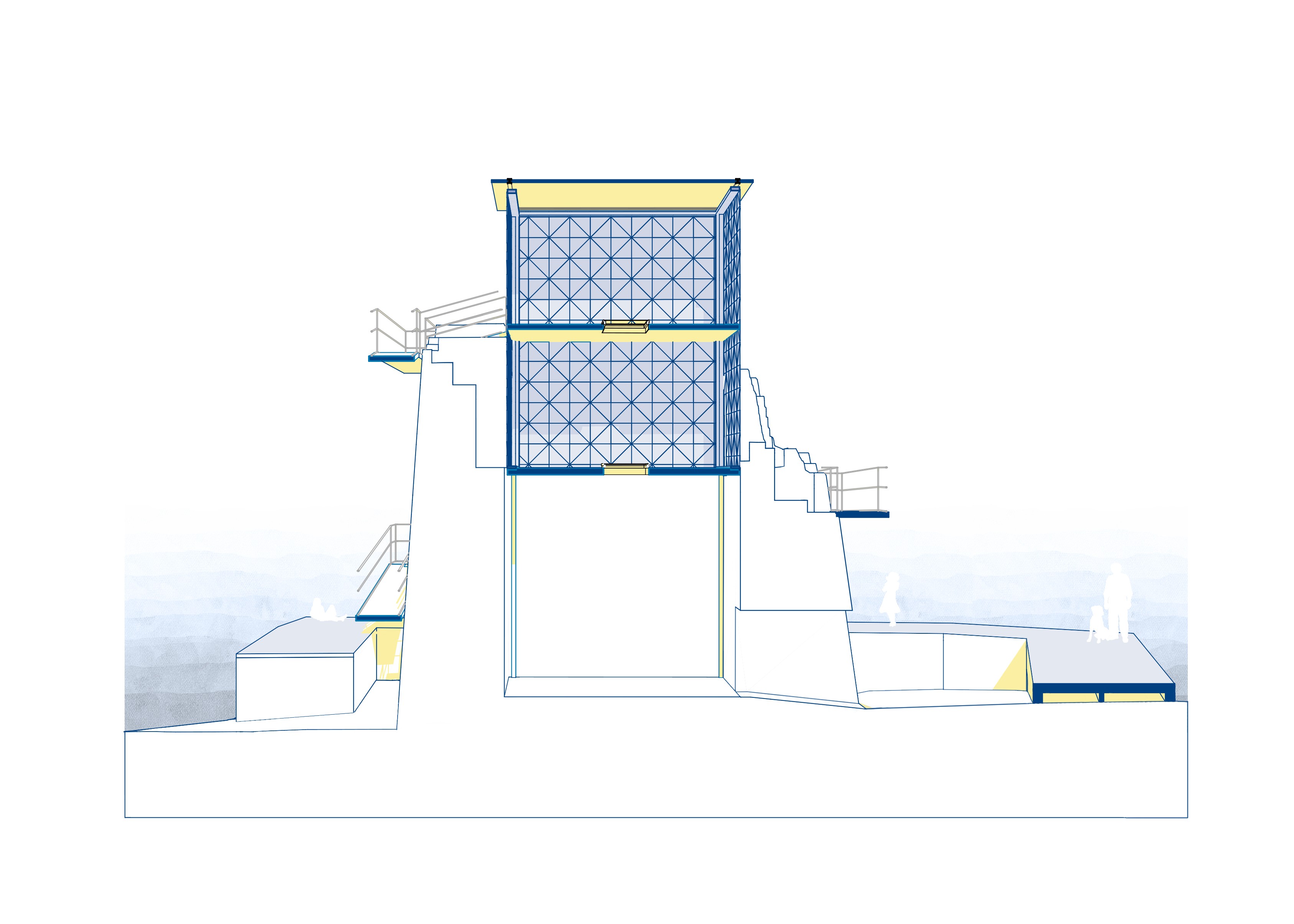 Un camminamento ligneo accompagna il visitatore dalla strada alla costa, ricalcando le antiche tracce dell’edificio e dando l’impressione di camminare sull’acqua. All’interno, tre piattaforme in legno ospitano attività meditative e di yoga. Una rampa esterna, accessibile e avvolgente, collega tutti i livelli fino al punto panoramico sommitale, con accessi alle piattaforme intermedie, rendendo il percorso fruibile a tutti.