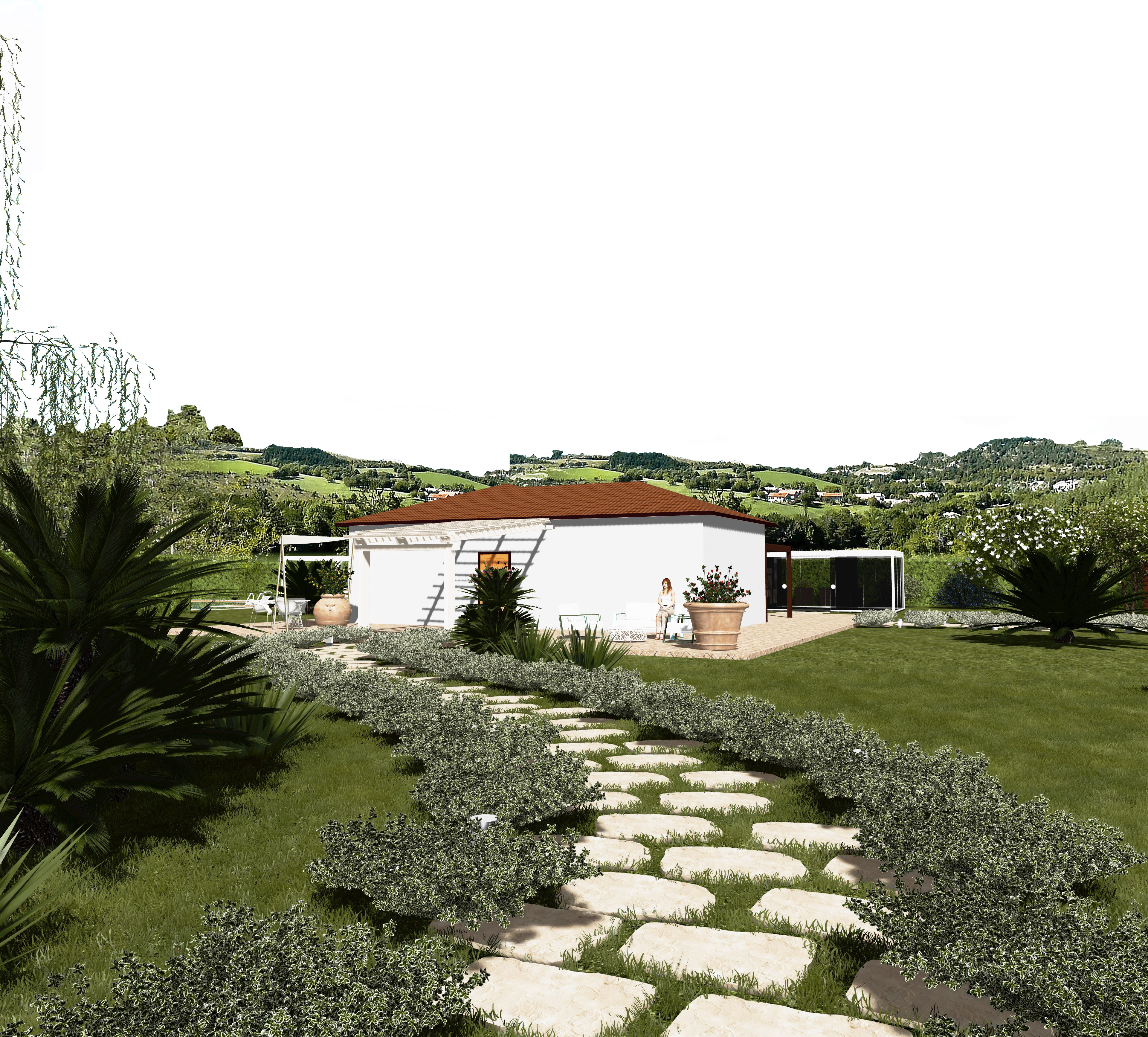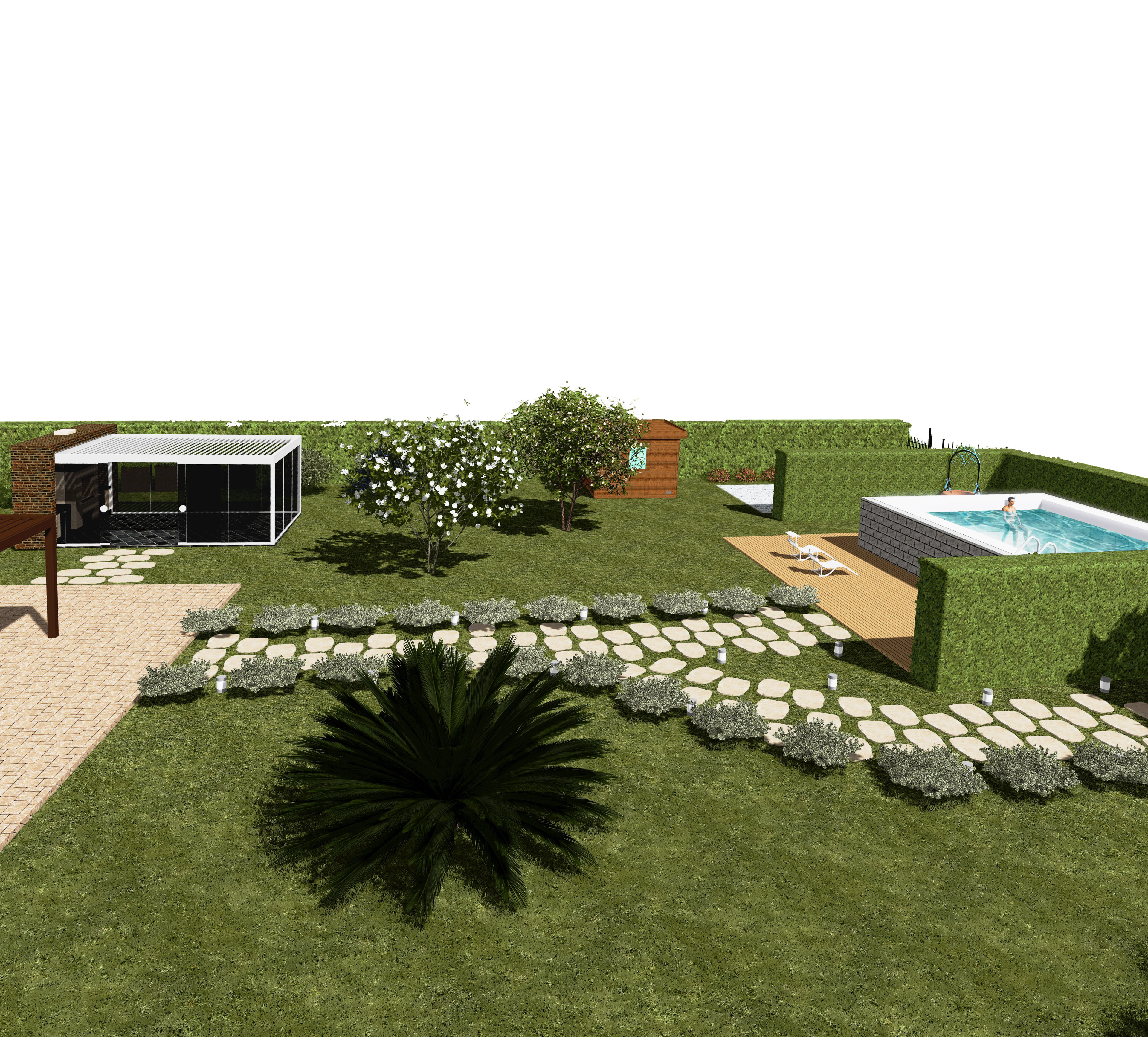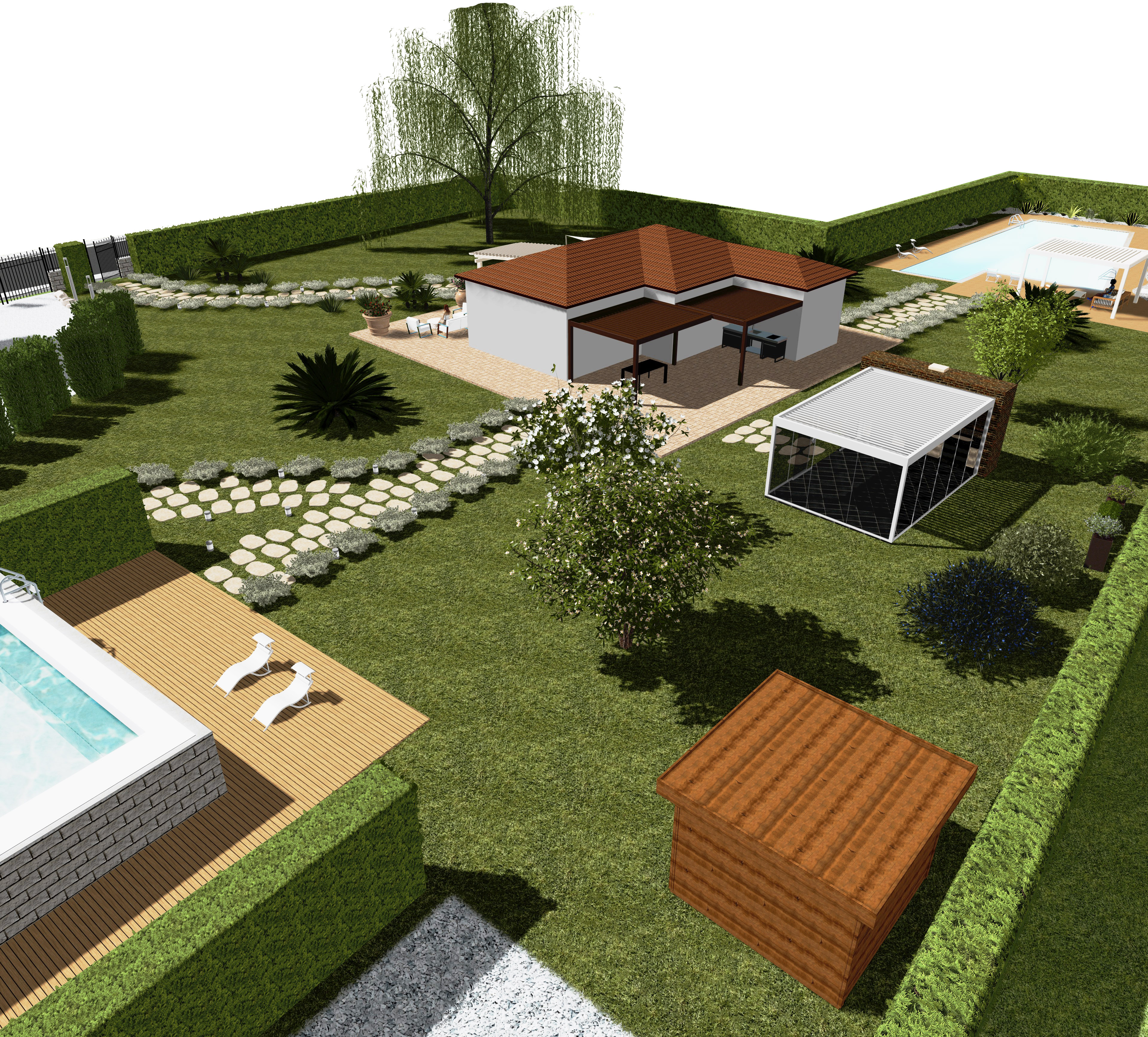 Gli elementi funzionali del progetto comprendono una piscina immersa nel verde, una vasca idromassaggio, un pergolato coperto adibito a parcheggio, e una pergola bioclimatica progettata per ospitare una cucina da esterno con annessa zona pranzo. Tutto è stato pensato per vivere all’aperto in ogni stagione, con comfort e continuità tra interno ed esterno.