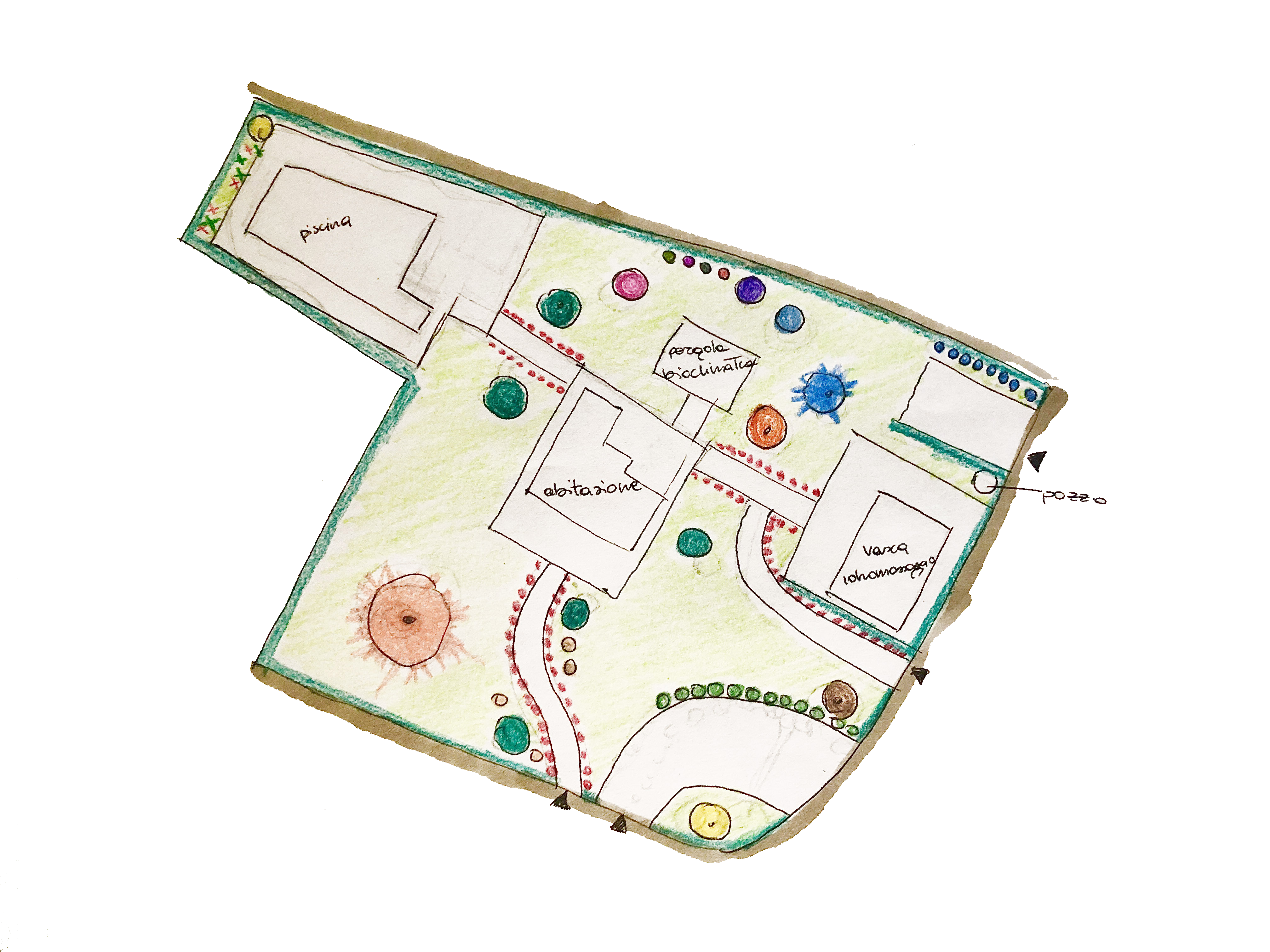 Il giardino ospita numerose specie botaniche selezionate per la compatibilità con il clima mediterraneo, con particolare attenzione alla vicinanza alla piscina e alla vasca idromassaggio: sono state infatti evitate specie caducifoglie per limitare al minimo la caduta di foglie in acqua e ridurre la necessità di manutenzione. Al contempo, la vegetazione è stata progettata per ombreggiare naturalmente le aree più vissute del giardino, contribuendo a creare un microclima fresco e piacevole.